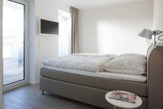 Besonders schön: Zwei große Terrassen – eine zur Ost- (24 qm), eine zur Westseite (34 qm) – schenken Ihnen Sonnenmomente zu jeder Tageszeit. Machen Sie es sich in den beiden Strandkörben bequem, lassen Sie den Tag mit einem Glas Wein ausklingen oder starten Sie mit einem Frühstück an der frischen Luft.